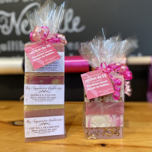 OCTOBRE ROSE le mois de la sensibilisation au cancer du sein. Pour chaque vente de l’un de nos emballages, 3$ (3 savons) et 5$ (5 savons) sera donné à la Fondation cancer du sein du Québec.